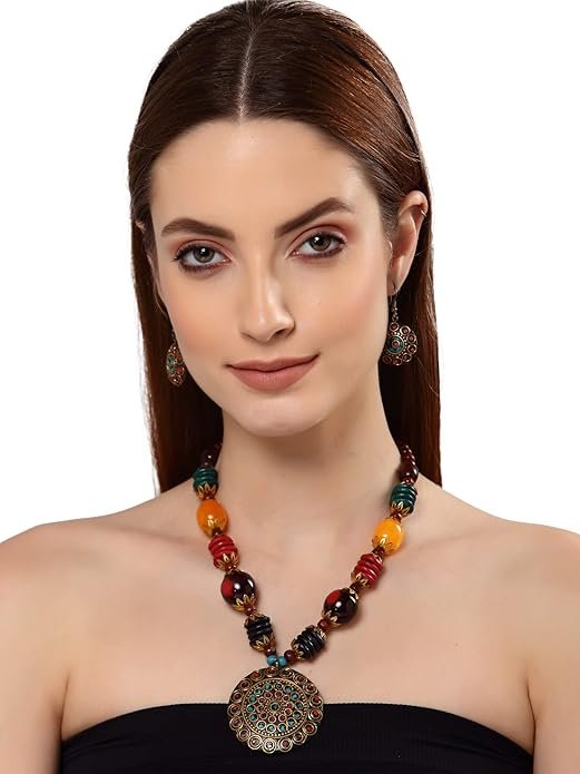 Dress up your jeans-and-tee combo by adding this necklace and earrings. A simple cotton cropped top brings out its vivid cultural energy.